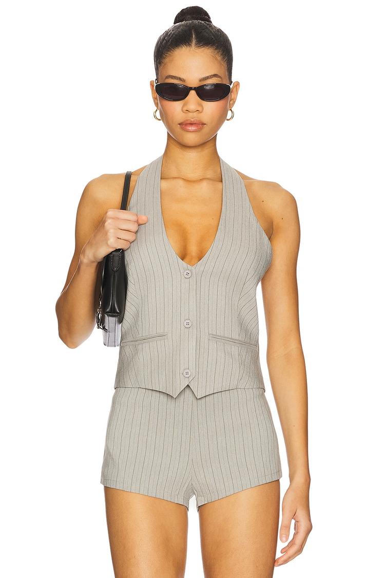 A sleek halter neck shell in midweight twill with a fitted silhouette and subtle pinstripe pattern, perfect for warmer seasons. Featuring a front button closure and elegant buckle detail at the open back, this waist-length top offers a modern, sexy vibe with functional faux welt pockets. Ideal for casual outings, date nights, or evening events, its structured yet breathable fabric blend of polyester and rayon ensures comfort and style. The neutral beige and white stripes create a timeless chic piece that elevates any look with effortless sophistication.