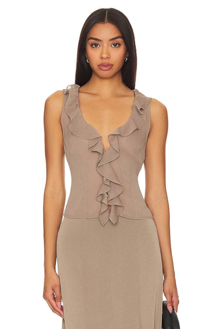 Soft ruffles cascade along the V-neckline and front of this fitted tank top, crafted from lightweight matte taupe polyester voile. Its sleeveless silhouette and waist length make it an ideal choice for warm spring and summer days, blending romantic and minimalist styles seamlessly. Perfectly suited for casual outings, brunch dates, or a relaxed date night, this chic top offers effortless elegance with a covered back and slip-on closure for comfort and ease. Elevate your wardrobe with this versatile piece that pairs beautifully with skirts or tailored pants.
