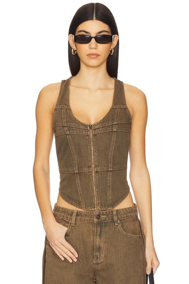 Structured with a sleek corset silhouette, this waist-length top features a fitted design with an exposed front zipper closure for an edgy touch. Crafted from a lightweight cotton-polyester canvas in a matte brown hue, it offers wide straps and a flattering U-neckline that blend casual chic with street style vibes. Ideal for layering or standalone wear, this versatile piece suits all weather and occasions like casual outings, brunches, and night outs, adding a trendy yet timeless element to your wardrobe.