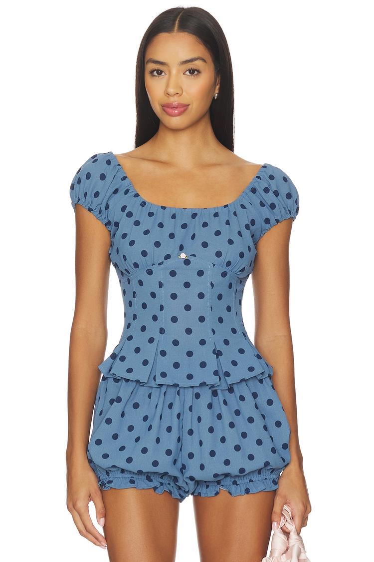 Lightweight poplin fabric and a fitted silhouette bring a vintage-inspired charm to this peplum top. Featuring a flattering square neckline and half-length puffed sleeves with shirred smocking, it adds a cute, casual chic vibe. The matte light blue base is adorned with classic black polka dots all over, enhanced by a hidden side zipper closure for a smooth fit. Perfect for spring and summer casual outings, brunches, or everyday wear, this waist-length top balances playful design details with effortless style.