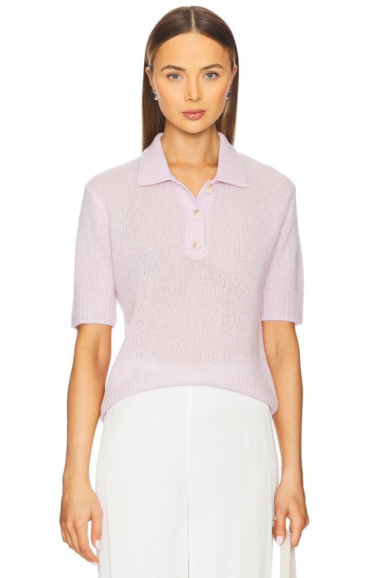 Effortless elegance meets everyday comfort in this lavender cropped polo sweater with short sleeves. Crafted from a luxe blend of 77% cashmere and 23% silk, it drapes softly in a lightweight knit with ribbed trim along the cuffs and hem. The structured polo collar and partial front button placket frame a refined neckline, while the semi-sheer knit adds a whisper of translucency for a modern, chic look. Cut close through the body with a cropped length, it pairs beautifully with high-waisted trousers or a flowing skirt for versatile workwear or relaxed weekend styling. Dry-clean only, an elevated staple for refined wardrobes.