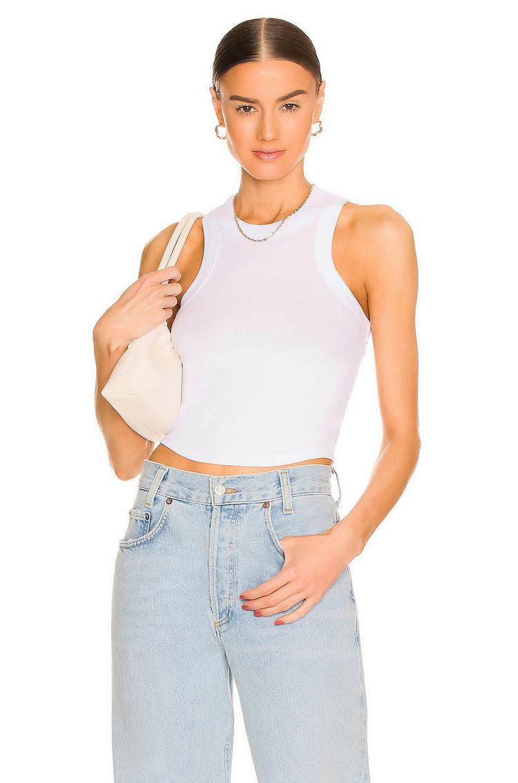 Soft ribbed jersey fabric and a fitted silhouette define this classic white tank top. Featuring a crew neckline and wide straps, it offers a clean, minimalist look that’s perfect for casual days, travel, or streetwear styling. The sleeveless design and waist-length cut ensure comfort and versatility for warmer seasons, while the rayon-spandex blend provides gentle stretch and breathability. Layer it under jackets or wear alone for an easy everyday staple that blends simplicity with subtle texture.