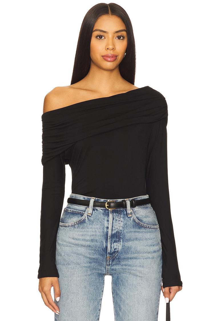 Softly ruched off-shoulder neckline and slim long sleeves define this black blouson top crafted from a smooth rayon-spandex blend. Its hip length silhouette hugs the body for a sleek, minimalist look perfect for autumn and winter outings. The covered back and subtle ruching details at the shoulders add refined texture and a chic edge. Ideal for casual days, brunch dates, or a relaxed evening out, this pullover top offers effortless style with a contemporary vibe.