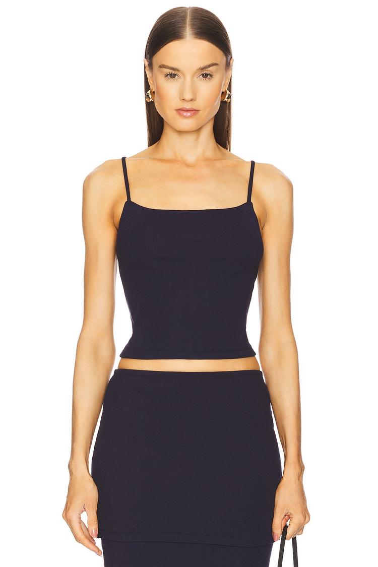 Sleek and minimalist, this matte black ribbed tank features a fitted silhouette with a square neckline and delicate spaghetti straps. Crafted from a midweight cotton-polyester-elastane blend, it offers comfortable stretch and a flattering cropped length. Ideal for warm spring and summer days, this tank pairs effortlessly with casual jeans or skirts for brunch, everyday wear, or relaxed outings. The pull-on style enhances ease and versatility, making it a chic staple for a casual chic wardrobe.