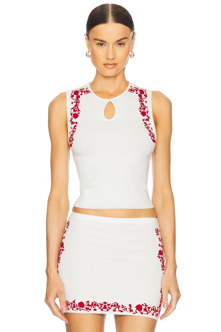 A reversible cropped top crafted from a smooth viscose-nylon knit blends modern style with versatility. This sleeveless piece features wide straps and a distinctive keyhole neckline, offering a fitted silhouette perfect for spring and summer outings. Red embroidered detailing along the front and sides adds a chic touch to the predominantly white base, while the reverse side flaunts a bold red with contrasting embroidery. Ideal for casual days, brunch dates, or relaxed evening gatherings, this top brings effortless elegance and adaptability to your wardrobe.