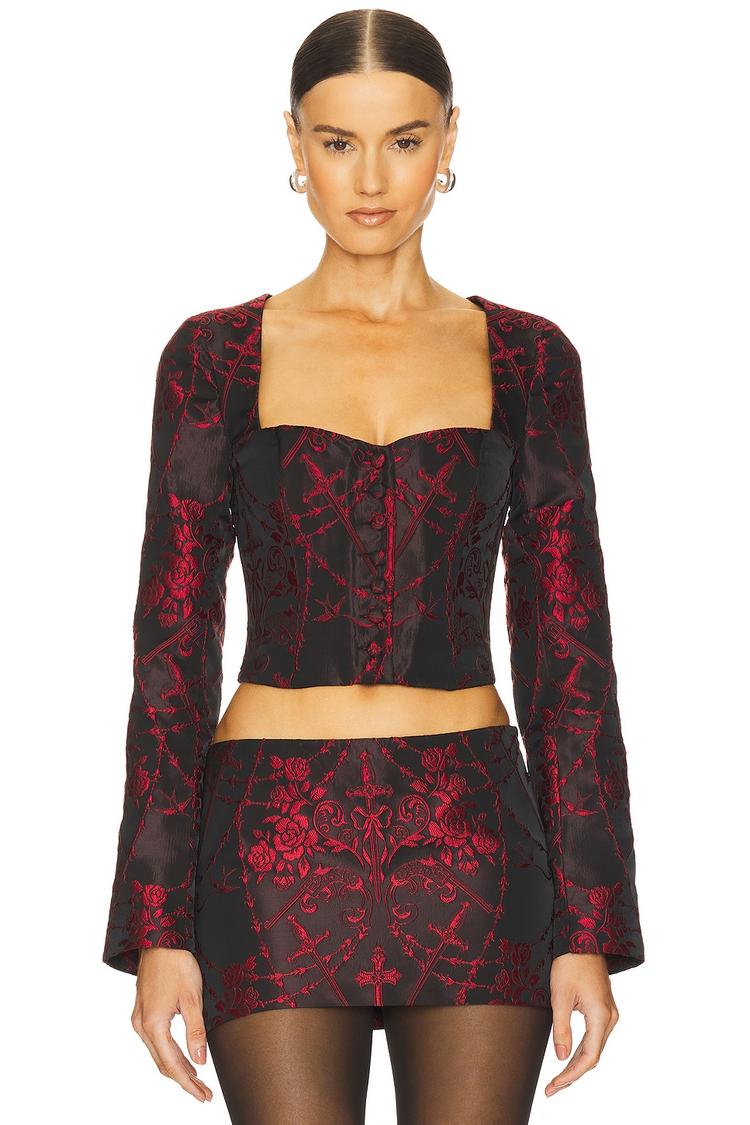 The Alice Bustier features a fitted corset silhouette crafted from a midweight jacquard fabric in matte black with a muted dark red baroque pattern all over. Its cropped length and long, regular sleeves complement the square neckline, while the boned bodice adds structure and elegance. Front button closure enhances the modern chic vibe. Perfect for night outs, date nights, and cocktail events, this piece blends classic baroque details with contemporary tailoring for a standout look in autumn, winter, or spring wardrobes.