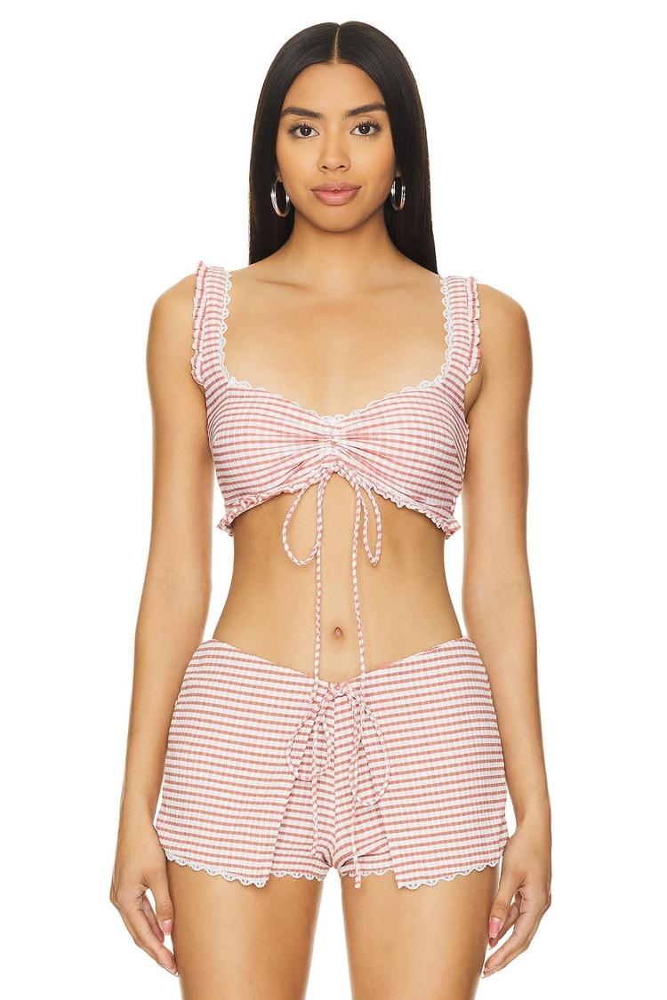 Lightweight seersucker fabric with delicate lace trim and a charming front ruched tie detail define this cropped top. Featuring a fitted silhouette and sleeveless design with wide straps, it showcases a soft U-neckline and a playful checkered pattern in dusty rose and white. Ideal for spring and summer, this casual chic piece works beautifully for brunch, casual outings, and vacation wear, offering a fresh and feminine touch to your warm-weather wardrobe.