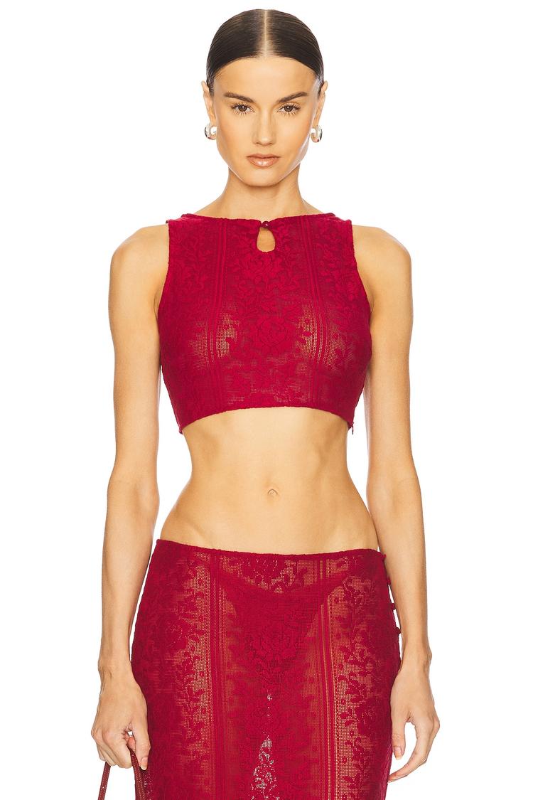 Intricately embroidered floral lace defines this fitted cropped top in a rich matte red hue. Featuring a sleeveless design with a round neckline and a subtle front keyhole detail, it closes with front buttons complemented by a partial side zipper for a sleek fit. The semi-sheer fabric adds a delicate allure, making it an elegant choice for spring and summer casual outings, brunches, or night outs. Its refined silhouette and sophisticated lace fabric create a chic, statement-making piece perfect for stylish, versatile wear.