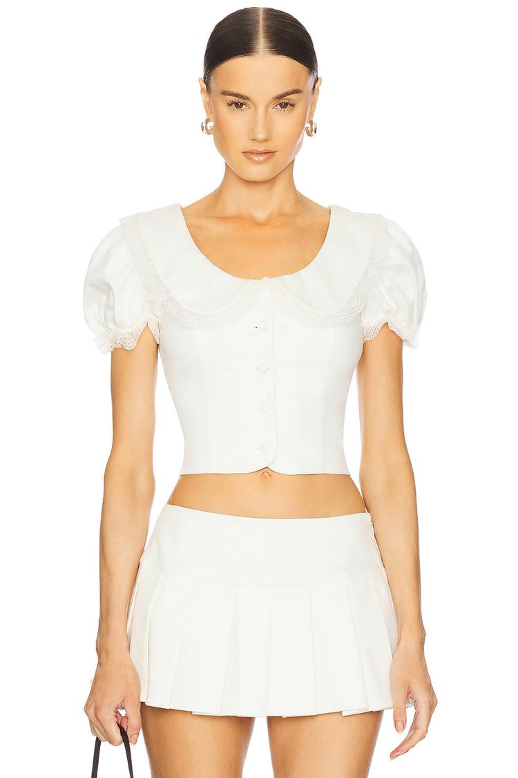 Effortless, feminine, and endlessly versatile, the Priscilla Top is a crisp white cropped staple in midweight poplin. Crafted from a cotton-viscose-elastane blend for breathable comfort and a touch of stretch, it features delicate lace trim at the collar and sleeves, a soft scoop neckline, and short puff sleeves that add romantic volume. A front button closure keeps the silhouette clean and polished, while the fitted cut flatters the waist. Pair with a high‑waisted skirt for brunch, tailored trousers for work, or denim for a chic city night out.