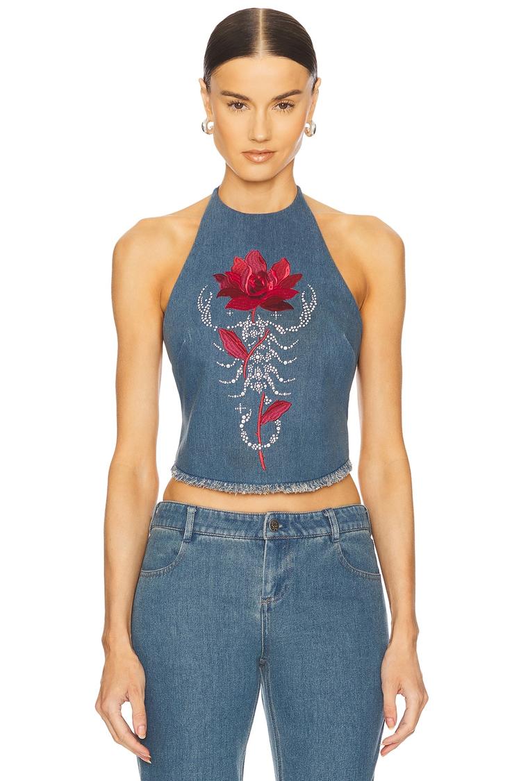 Bold and trendy, this cropped halter top showcases a slim fit and sleeveless silhouette perfect for summer wear. Crafted from a cotton-polyester blend, it features a matte denim blue base with striking bright red embroidered roses and subtle silver beaded accents on the front. The tie-back closure enhances its edgy vibe, while the frayed hem adds a touch of casual charm. Ideal for casual outings, brunch dates, or night outs, this top balances eye-catching design with comfortable fabric and flattering fit for versatile seasonal style.