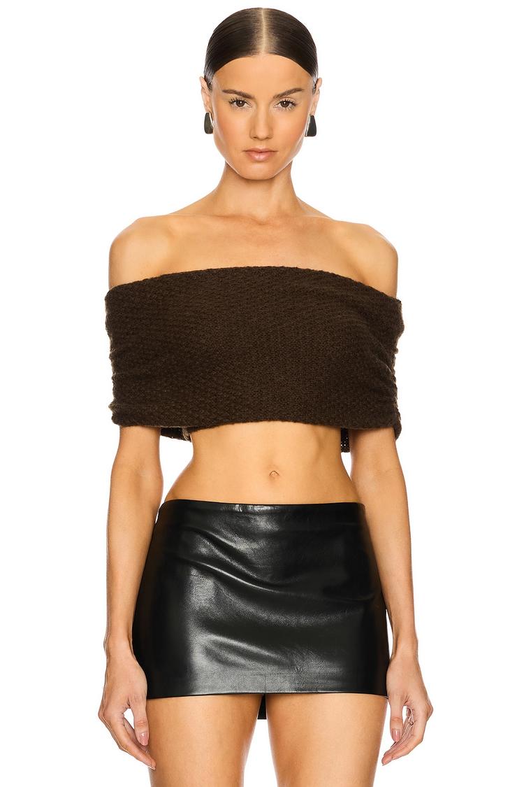 This off-shoulder bandeau top in a rich matte brown hue showcases a fuzzy knit fabric that combines nylon, acrylic, and wool for cozy warmth. The cropped length and fitted silhouette highlight the midriff, while the pullover style with an elastic foldover neckline ensures a snug and comfortable fit. Its sleeveless, strapless design makes it a chic choice for casual outings, brunches, or night outs during autumn and winter seasons. The textured knit adds a tactile dimension, blending comfort and style effortlessly.