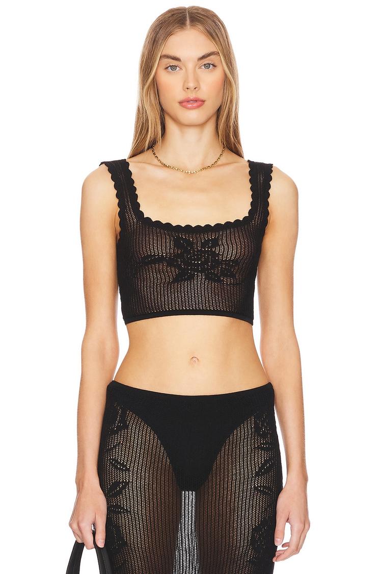 Delicate open knit fabric with floral and striped patterns defines this fitted cropped top in a classic black hue. Featuring wide straps and a square neckline, this sleeveless piece blends modern sensuality with comfort. Made from a cotton, lace, and nylon blend, it offers breathable wear ideal for spring and summer. Versatile for casual outings, loungewear moments, or a night out, its semi-sheer texture adds an alluring touch while maintaining everyday ease with pullover styling.
