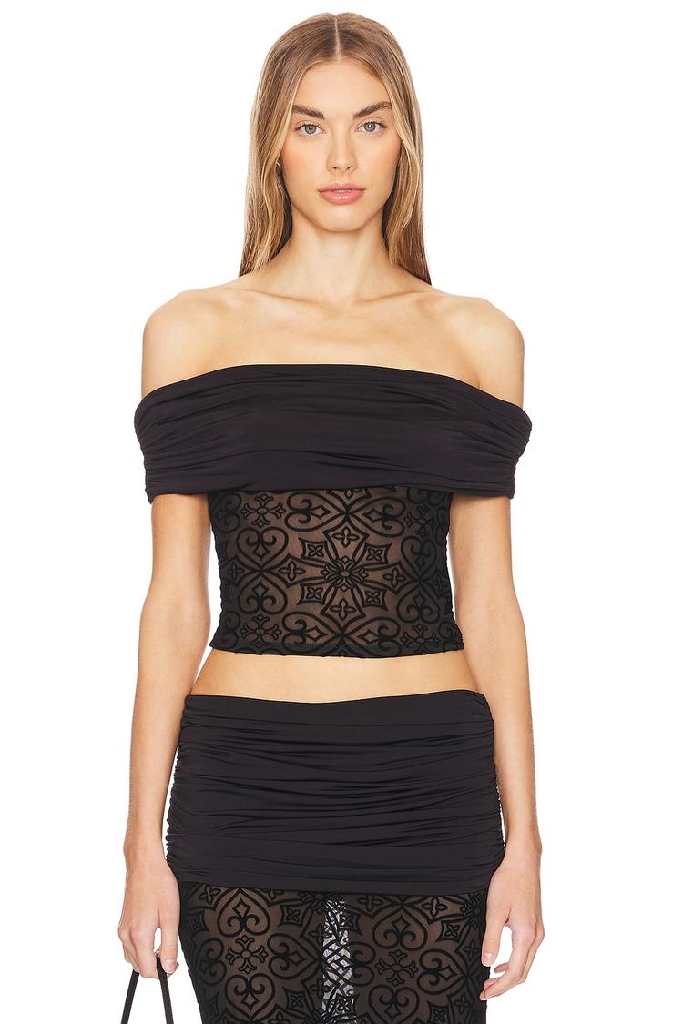 Elegant off-shoulder cropped top with a fitted silhouette and ruched jersey neckline, crafted from stretchy polyester-elastane blend. The sheer mesh bodice features intricate velvet pattern detailing, adding a sophisticated texture to this matte black design. Ideal for warm spring and summer evenings, its strapless sleeve styling enhances its sexy and chic appeal. Versatile enough for casual outings, night outs, and date nights, this pullover top combines comfort and style effortlessly for a standout look.