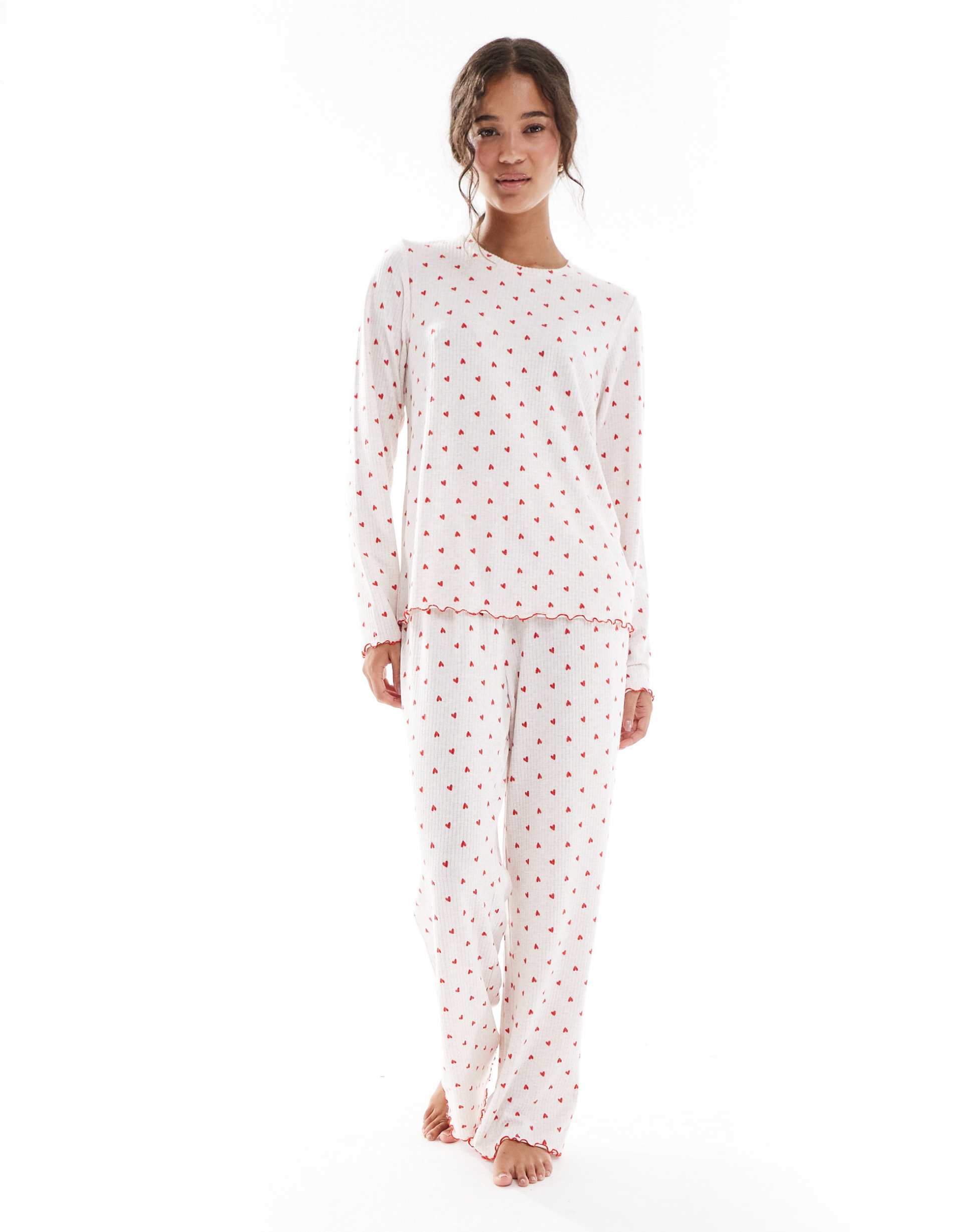 LOUNGEABLE HEATHER BRUSHED RIB LONG SLEEVE TOP AND PANTS SET IN CREAM HEART PRINT