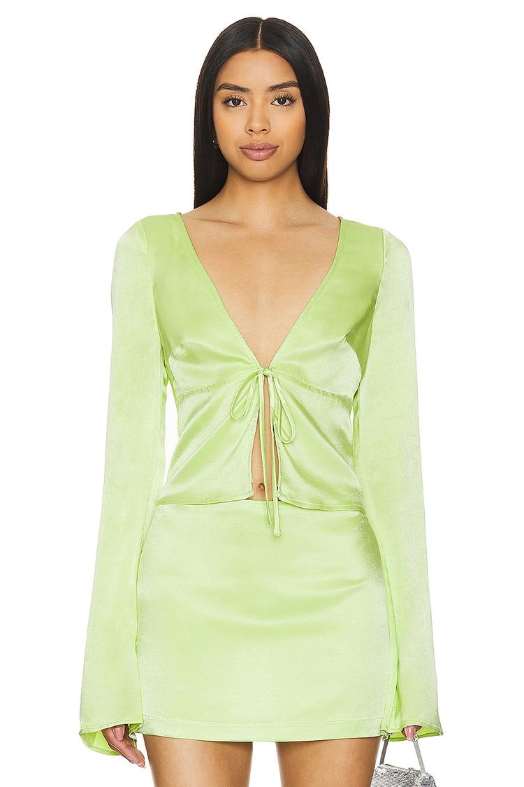 A shimmering light green satin wrap top with a plunging neckline and front tie closure, designed to flatter with a slim fit and long regular sleeves. The waist-length silhouette offers a modern, trendy look perfect for spring and summer evenings. Ideal for date nights, girls night out, or a chic night out on the town, this Adriana Top combines sensual style with comfortable fabric composition featuring viscose, polyester, and elastane for a slight stretch and smooth finish.