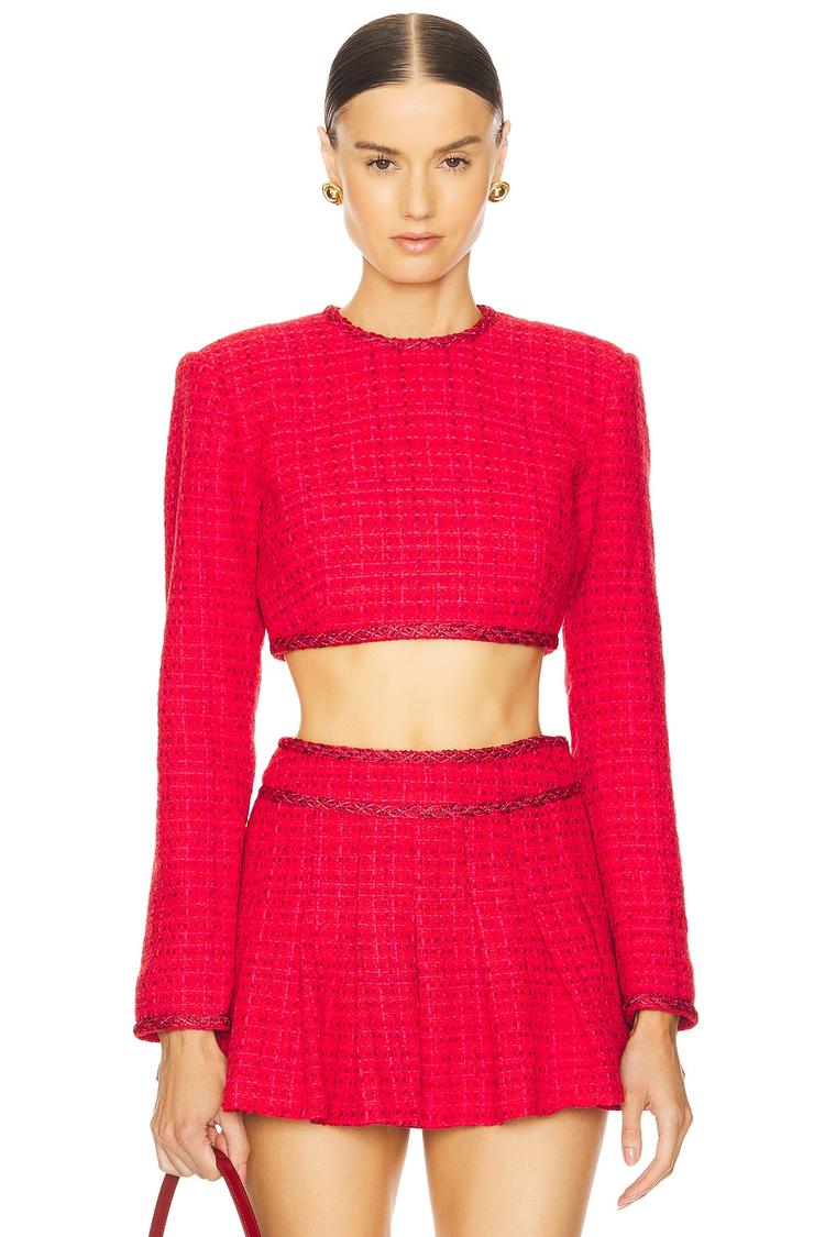 A bright red cropped top crafted from textured tweed fabric features structured padded shoulders and a fitted silhouette. The round neckline and long regular sleeves enhance its classic appeal, while the concealed back zipper ensures a sleek finish. Perfect for layering during autumn and winter, this chic piece suits casual outings, brunch dates, and vibrant night events with ease.