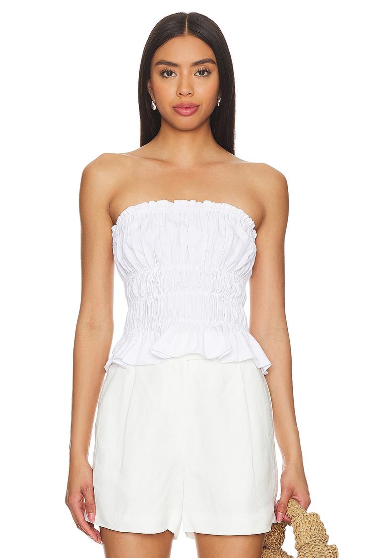 Smocked elastic bodice and delicate ruffled hem define this fitted bandeau top crafted from crisp white poplin and nylon blend. The strapless neckline and sleeveless styling highlight a minimalist yet chic summer silhouette that pairs perfectly with casual brunches, beach vacations, and everyday warm-weather outings. Its waist-length cut ensures a flattering fit that complements a variety of bottoms, making it a versatile staple for your seasonal wardrobe.