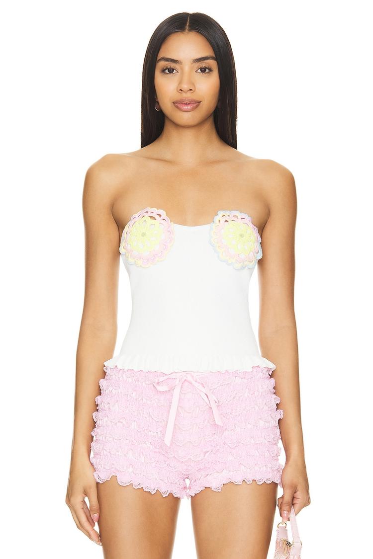 Soft ribbed knit fabric shapes this fitted tube top in a clean white hue, featuring delicate crochet floral appliques in pastel pink and yellow at the bust. The strapless neckline and sleeveless styling create a playful, summery silhouette, while the ruffled hem adds a flirty detail. Perfect for casual days, brunch dates, or beach vacations, this hip-length top offers versatile bohemian charm with a casual chic vibe and breathable cotton blend comfort.