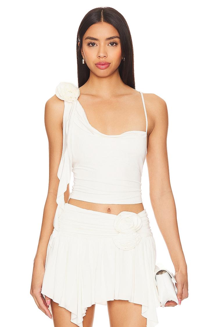 Delicate draping and a rosette accent bring a feminine charm to this fitted camisole featuring an asymmetric neckline and singular adjustable spaghetti strap. Crafted from a slinky viscose-elastane blend, this cropped top offers a modern romantic silhouette that pairs beautifully with your favorite skirts or jeans. Ideal for spring and summer evenings, it's perfect for date nights, brunches, or night outs where effortless elegance is key.