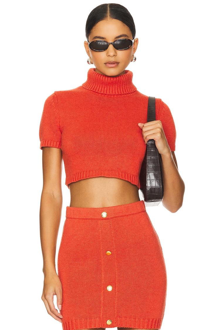 A vibrant matte bright orange cropped top crafted from a midweight knit blend of cotton, nylon, and wool, offering a fitted silhouette that contours the body. Featuring a classic turtle neck and half sleeves, this pullover piece combines warmth with style perfectly suited for autumn, winter, and spring. Its cropped length and regular sleeves create a modern chic vibe ideal for casual outings, brunch, or date nights. The clean, solid design enhances versatility, making it an essential staple for contemporary casual chic wardrobes.