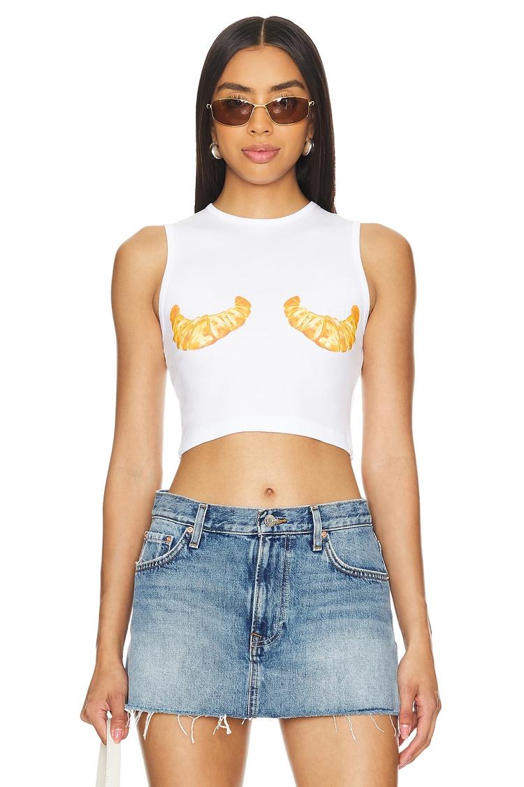 Lightweight cotton jersey and a cropped, fitted silhouette define this sleeveless tank with wide straps and a classic crew neck. The crisp white fabric is accented by playful yellow croissant graphics on the front, adding a casual chic vibe perfect for spring and summer days. Ideal for everyday wear, brunch outings, or relaxed weekend errands, this tank pairs effortlessly with denim and embodies minimalist style with a fun twist.