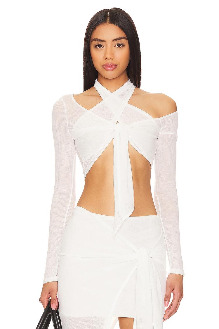 A striking white cropped top crafted in lightweight polyester jersey, featuring a sultry halter neck and a distinctive crisscross front with a tie closure that adds a playful yet sexy vibe. The slim fit and long sleeves balance the daring open design, making it ideal for warm spring and summer days. Perfect for casual outings, brunches with friends, or a night out, this whimsical top blends fashion-forward style with breezy comfort.