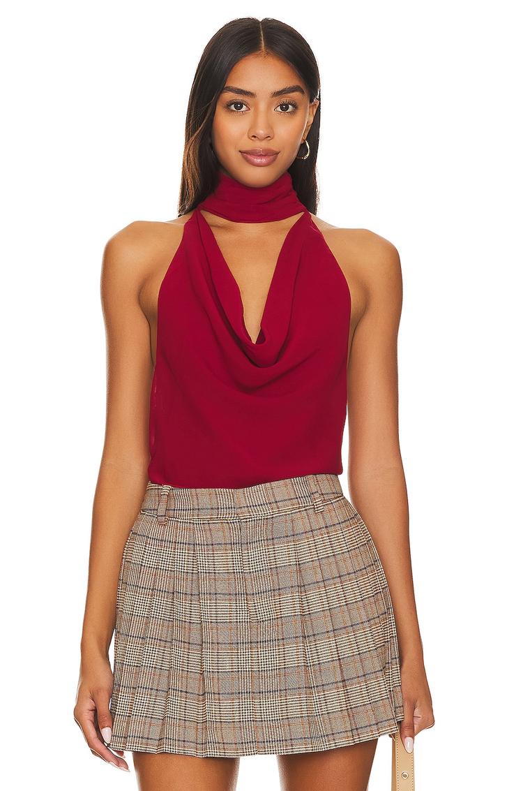 Draped crepe fabric forms a striking red camisole with a chic cowl neck and open back featuring a halter tie. This fitted, sleeveless top hugs the hips for a sleek silhouette. The hidden back zipper closure adds a seamless finish. Perfect for spring and summer, its sexy and modern style makes it ideal for casual outings, brunch dates, or a night out on the town. The elegant draping detail on front and back enhances the top’s sophisticated vibe, offering versatile styling for day-to-night wear.
