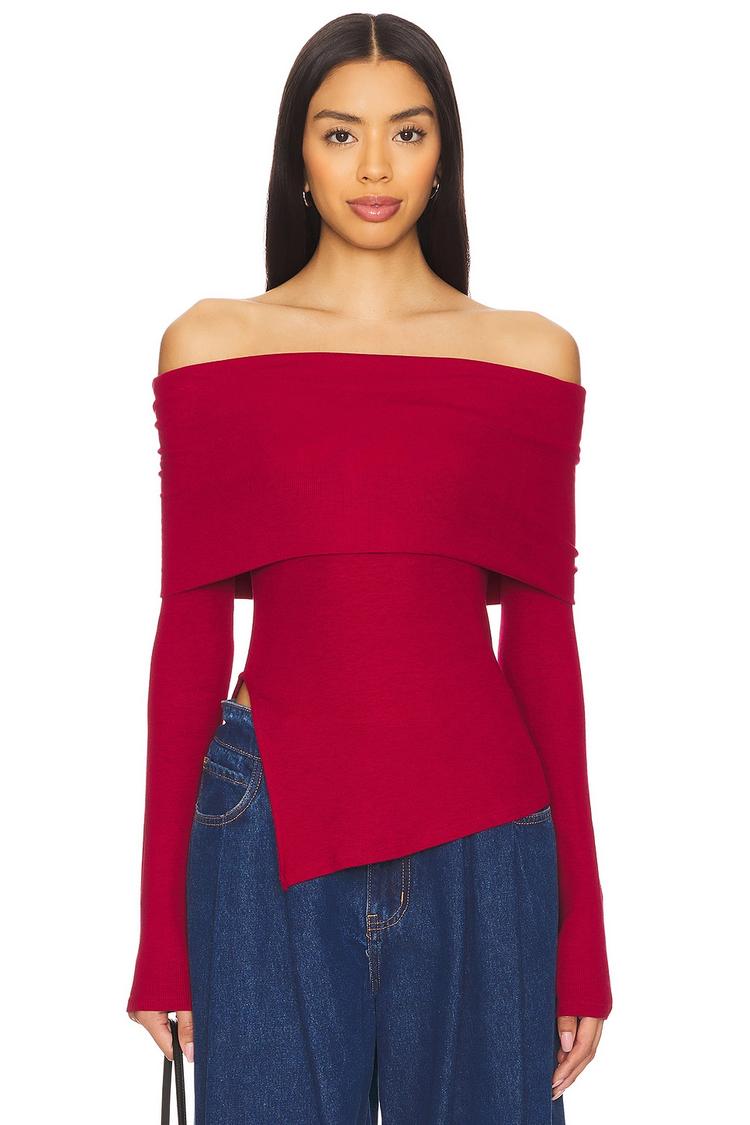 A striking matte red cropped top crafted from a midweight ribbed viscose-elastane blend offers a fitted silhouette that flatters every curve. The off-shoulder neckline and long regular sleeves create a chic, modern appeal while the asymmetric hem with a side slit adds a subtle edge. Ideal for autumn, winter, and spring, this pullover piece seamlessly transitions from casual brunches to intimate date nights and lively nights out. Its ribbed texture and sleek design make it a versatile and sexy choice for contemporary wardrobes.