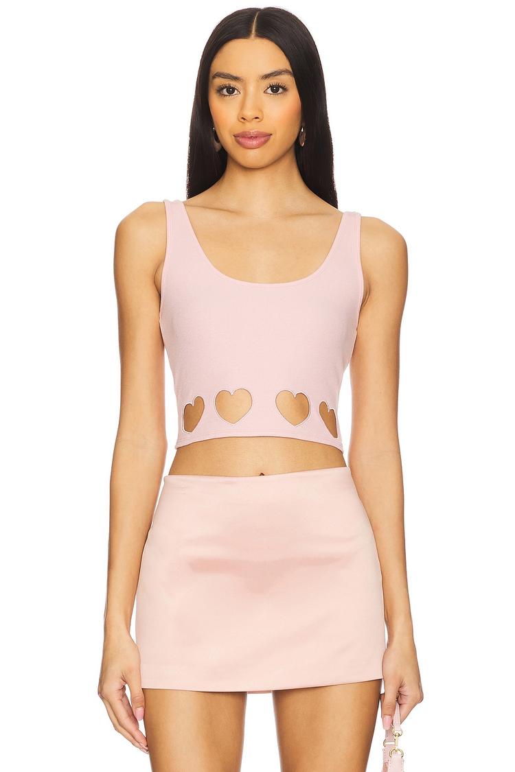 Soft ribbed cotton with a touch of elastane shapes this fitted cropped top featuring a feminine U-neck and wide straps for comfortable wear. The standout wrap-around heart cut-out detailing along the hem adds playful charm to its light pink hue. Perfect for warm weather, this sleeveless top transitions seamlessly from casual brunches and vacations to everyday relaxed outings, combining comfort and cute style effortlessly.