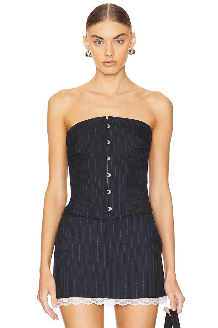 Sleek and modern, this fitted corset top features a straight strapless neckline and lightweight suiting fabric with subtle pinstripes. The front hook closure and boned bodice deliver a structured silhouette, while the cropped length and delicate lace trim add a touch of femininity. Crafted from a blend of polyester, viscose, wool, and elastane, it offers comfortable stretch and style versatility. Ideal for casual outings, date nights, and evening events, this chic corset top pairs effortlessly with skirts or tailored pants for a confident, polished look.