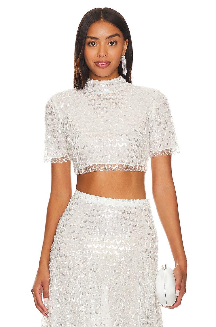 Delicately crafted from beaded and sequined tulle, this cropped Emilia Top features a high neckline and fitted silhouette that flatters the figure. With half sleeves and a hidden back zipper closure, it offers elegant coverage while showcasing intricate all-over embellishments in white. This chic and sophisticated piece is perfect for cocktail parties, semi-formal events, or any occasion where you want to shine with subtle glamour.