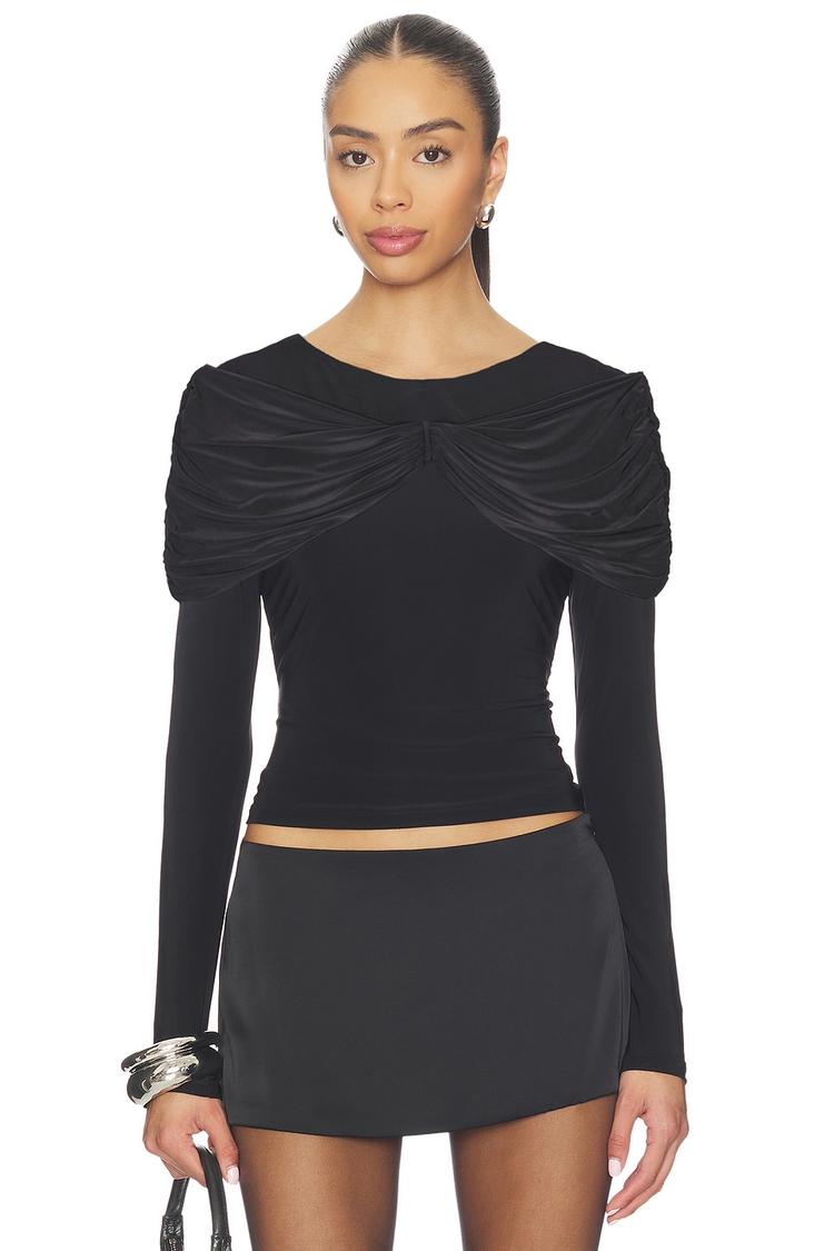Elegant and sleek, this fitted matte black top features long sleeves and a flattering round neckline. Crafted from stretchy polyester-elastane jersey, it offers comfortable pull-on styling with ruched detailing elegantly gathered on the shoulders for a modern chic vibe. Its waist-length silhouette pairs perfectly with skirts or pants, making it a versatile choice for casual outings, night outs, or date nights during spring, autumn, and winter seasons.