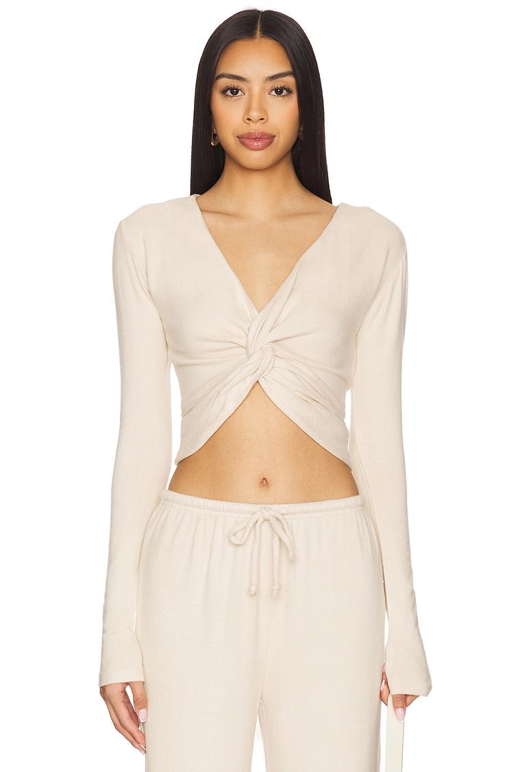 Soft terrycloth fabric and a slim, cropped silhouette define this wrap top with a flattering V-neckline and long regular sleeves. The draped front accentuates the waist, creating a modern and casual chic vibe ideal for casual outings, brunch dates, or night outs. Its pullover style and covered back offer comfortable wear, while the cream shade adds a versatile, understated elegance suitable for all seasons.