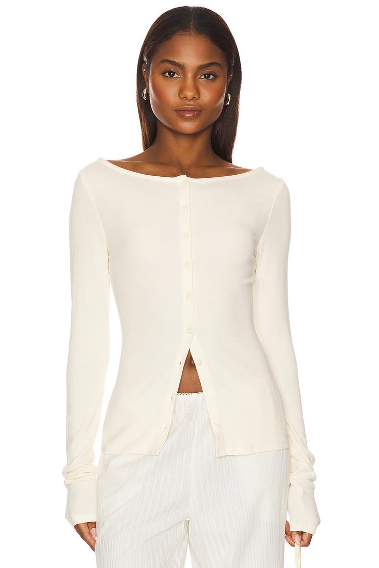 Softly ribbed in a sleek viscose blend, this off-white Jeanna Top features a flattering slim fit and classic boatneck neckline. The long sleeves and front button closure add a timeless touch, while the hip-length silhouette ensures versatile styling for casual outings, brunches, or everyday wear. Its minimalist design and comfortable stretch make it an essential piece for a chic yet understated wardrobe.