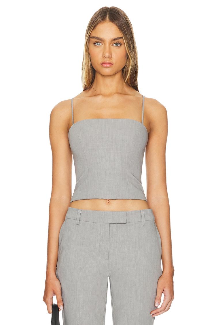 A sleek matte gray cropped top in a fitted silhouette features minimalist spaghetti straps and a straight neckline, tailored for a polished yet modern look. The waist-length hem and concealed back zipper ensure a seamless finish, while the blend of polyester, viscose, wool, and elastane delivers structured comfort. This versatile piece transitions effortlessly from workwear and business casual settings to casual brunches and date nights, embodying classic chic style with a sophisticated edge.