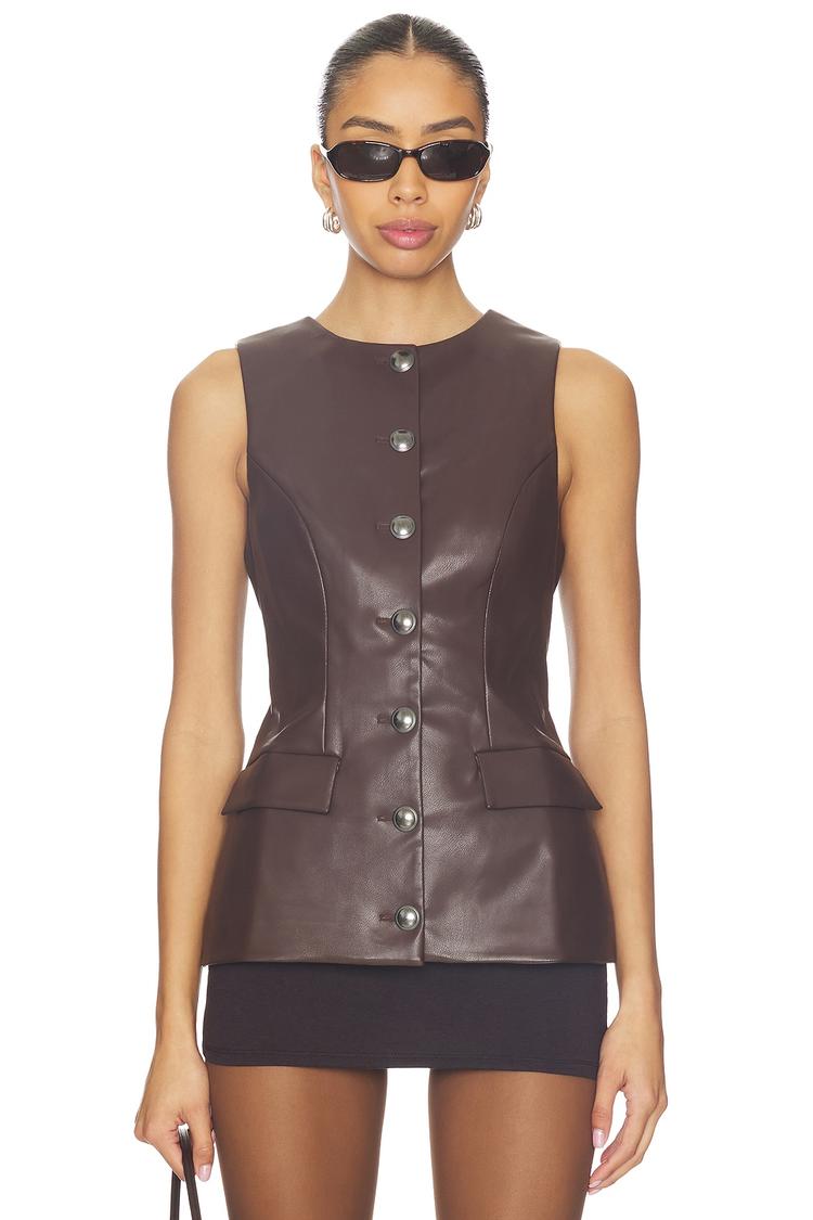 Sleek and structured, this fitted faux leather shell top features a matte brown finish with a classic round neckline and sleeveless silhouette. The front button closure and welt pockets add a touch of sophistication, while the hip-length cut offers versatile styling options. Crafted from polyester with a smooth faux leather texture, it suits transitional seasons like autumn and spring. Ideal for casual outings, business casual settings, or a chic night out, this modern and polished piece elevates your wardrobe effortlessly.