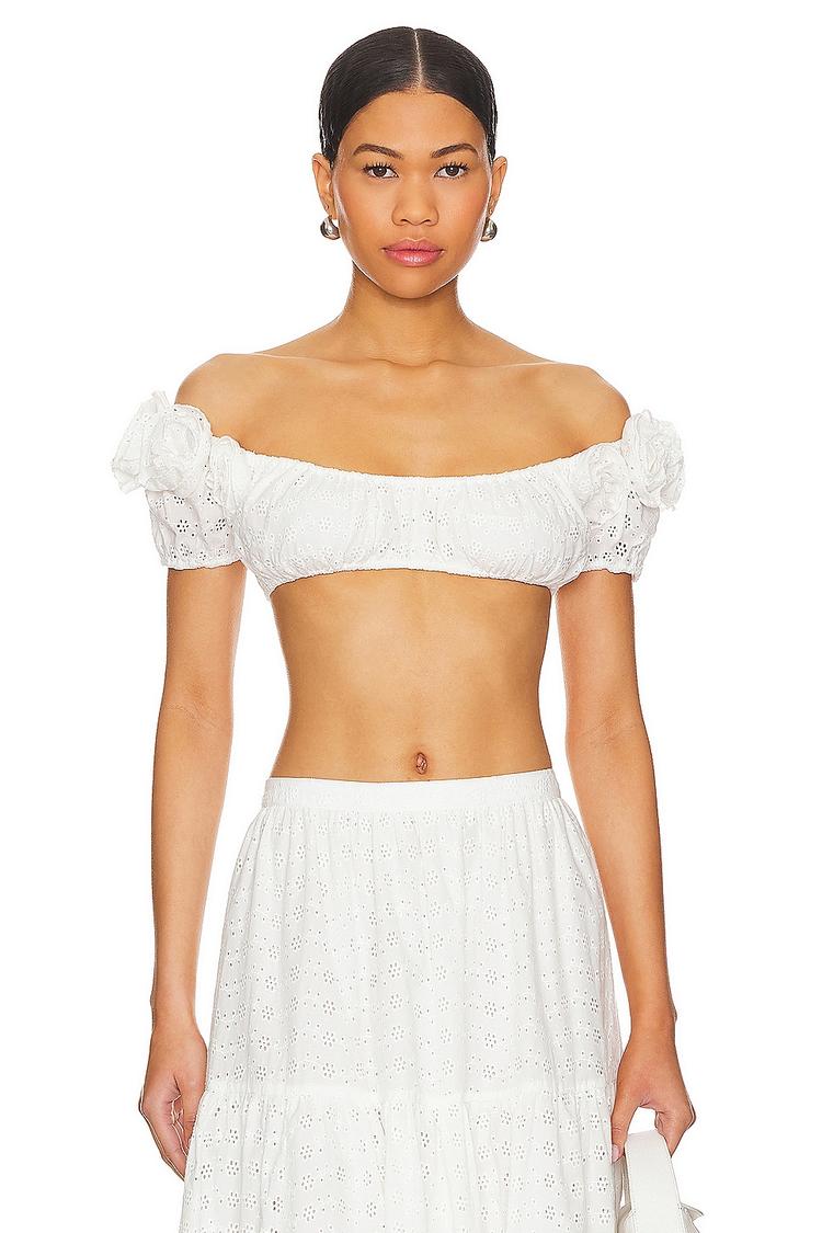 Crisp white cotton and viscose blend with delicate rosette details on the shoulders create a romantic off-shoulder cropped top. The fitted silhouette and puffed half sleeves add a whimsical, bohemian charm, perfect for warm spring and summer days. Its lightweight eyelet fabric enhances breathability and comfort, making it ideal for casual outings, beach vacations, and relaxed daytime events. The covered back and slip-on design provide ease of wear, combining effortless style with carefree elegance for a standout seasonal essential.