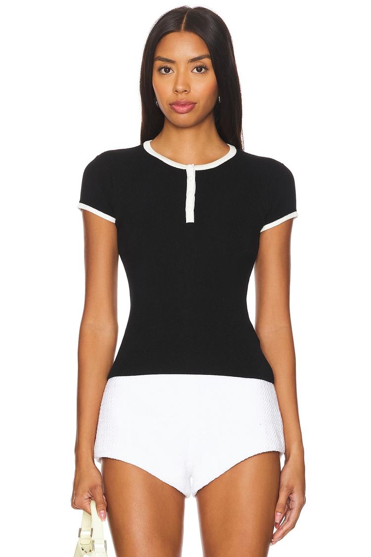 Sleek and form-fitting, this slim henley top features a classic black base accented with crisp white trim along the neckline and sleeve cuffs. Crafted from a comfortable blend of cotton, viscose, and nylon in a slinky knit fabric, it offers a flattering waist-length silhouette perfect for casual wear. The half sleeves with cuffed styling and buttoned henley neck add subtle detail, making it a versatile piece for spring, summer, and autumn. Ideal for everyday outings, brunch dates, or relaxed weekends, this minimalistic top blends comfort with a polished casual chic vibe.