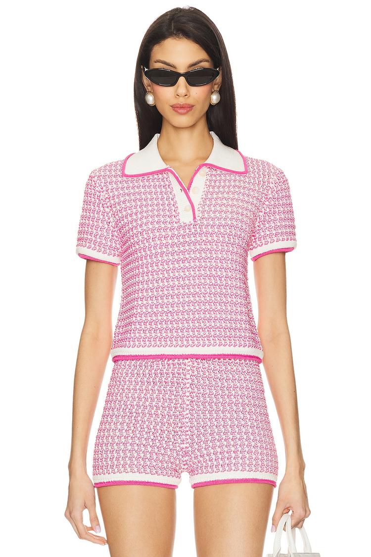 This midweight crochet polo top features a slim fit silhouette with a classic pink and white checkered pattern that exudes preppy charm. Crafted from a cotton-nylon knit blend, it offers breathable comfort for spring and summer days. The hip-length design is enhanced by a crisp polo collar and half sleeves, while the partial front button closure adds a refined touch. Finished with color-blocked trim and a raw cut hem, this top is perfect for casual outings, brunch dates, and everyday wear, combining timeless style with modern detailing.