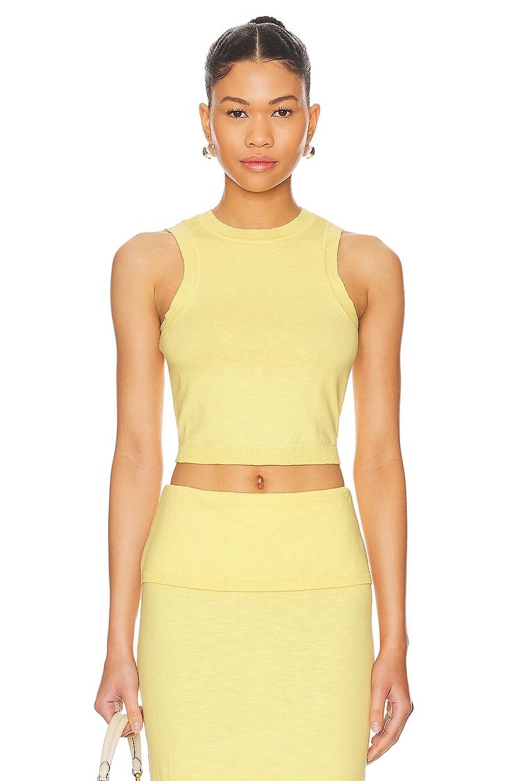 Soft lightweight knit fabric in a light yellow hue brings a fresh, minimalist vibe to this fitted tank top. The cropped length pairs effortlessly with high-waisted bottoms, while wide straps and a high neck offer a sleek, modern silhouette. Perfect for casual outings, brunch dates, or everyday wear in warmer seasons, this versatile tank combines comfort and style with breathable cotton, viscose, and nylon blend. Its clean, solid design makes it an essential piece for a chic, casual wardrobe.