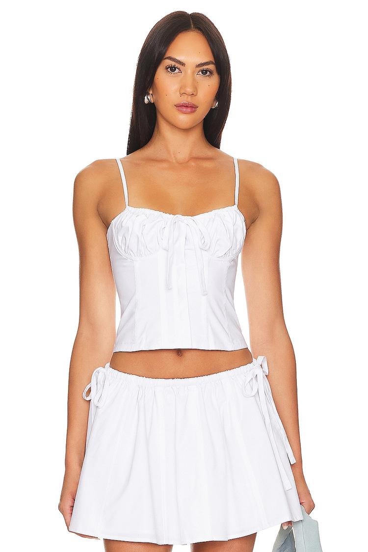 Crisp white cotton poplin defines this fitted cropped corset top with a structured boned bodice and adjustable spaghetti straps. The elegant sweetheart neckline and front button closure create a feminine silhouette perfect for spring and summer days. Ideal for casual brunches, daytime dates, or stylish streetwear looks, this versatile piece balances classic charm with modern tailoring. Its thick fabric and boning add structure while maintaining comfort, making it a standout choice for refined, warm-weather ensembles.