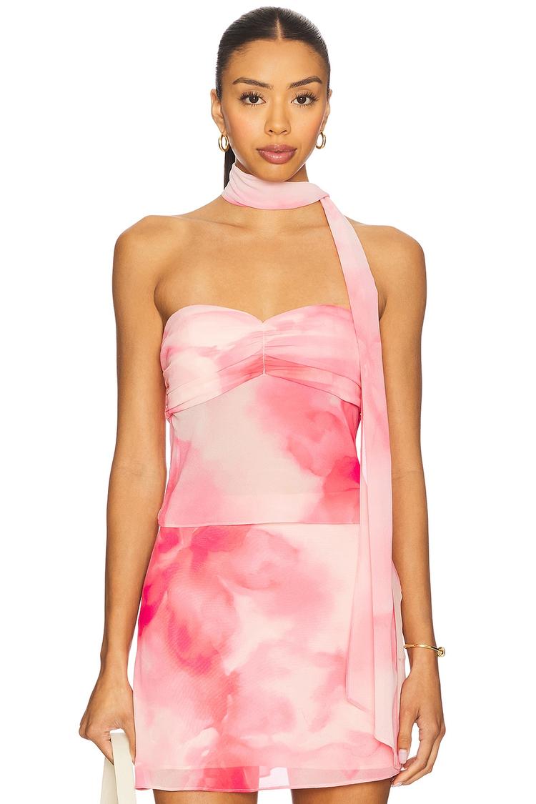 Softly draped in lightweight georgette polyester, this fitted corset top features a strapless straight neckline and a hidden side zipper for a seamless look. The abstract pink and red pattern covers the cropped silhouette, enhanced by an included matching scarf for versatile styling. Ideal for spring and summer evenings, it suits elegant cocktail parties, date nights, and night out occasions with a chic, sexy appeal.
