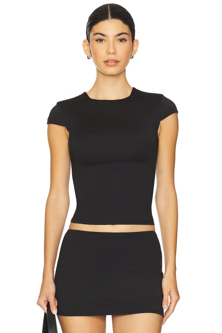 Sleek matte black polyester fabric shapes this fitted cropped top with cap sleeves and a classic crew neck. Designed for a streamlined silhouette, it features a covered back and pullover styling, perfect for versatile wear. Ideal for casual days, date nights, or a night out, this minimalist and modern top pairs effortlessly with skirts or pants, offering a chic, sexy vibe all year round.