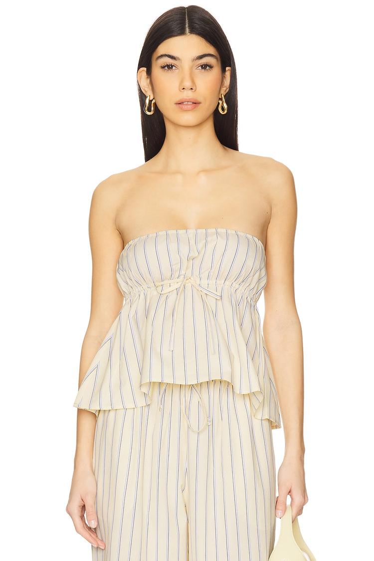 Lightweight poplin fabric and a strapless bandeau silhouette create a breezy, effortless vibe in this hip-length top. Featuring subtle beige stripes over an off-white base, the loose fit and ruffled hem add a playful touch, while the front drawstring tie closure enhances adjustability. Perfect for spring and summer outings, this minimalist, casual chic top transitions seamlessly from a relaxed brunch to a vacation day by the beach. Its covered back and strapless neckline offer a clean, modern look that pairs well with high-waisted bottoms for an easygoing yet stylish ensemble.