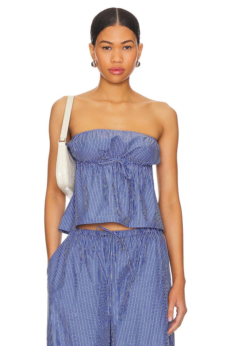 Crisp cotton poplin and a vibrant matte blue hue define this strapless bandeau top with a relaxed peplum silhouette. Featuring a playful front tie detail and ruffled layering, it captures carefree summer vibes with a lightweight, breathable feel. The waist-length hem and covered back create a flattering shape that’s perfect for casual brunches, city strolls, or vacation days. Effortlessly stylish and modern, this top blends trend-forward design with everyday comfort for versatile seasonal wear during spring and summer.