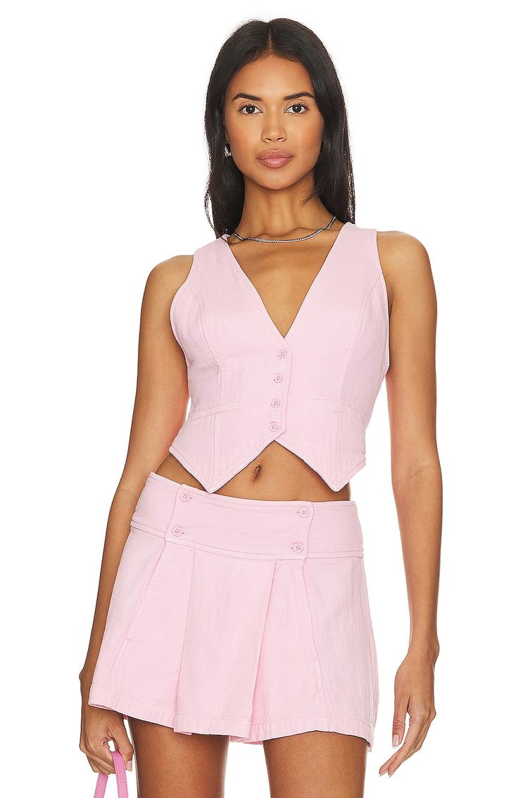 Soft cotton gauze and a fitted corset silhouette define this cropped top in a light pink hue. Featuring a flattering V-neckline and wide, adjustable straps, it closes with front buttons and ties at the back for a customizable fit. The midweight fabric gives it structure while maintaining breathability, making it ideal for spring and summer wear. Its classic yet cute style pairs effortlessly with casual or brunch looks and is perfect for date nights. Elevate your warm-weather wardrobe with this versatile, feminine piece that balances comfort and chic detail.