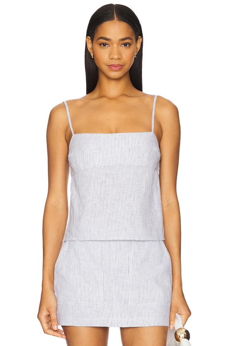 Light gray linen and viscose blend fabric shapes this slim-fitting camisole with a straight neckline and delicate spaghetti straps. The hip-length top features an open back with a tie-up closure and adjustable straps for a personalized fit. Its minimalist and casual chic design makes it ideal for spring and summer days, perfect for casual outings, brunch dates, or vacation wear. The breathable, midweight fabric ensures comfort and effortless style in warm weather.