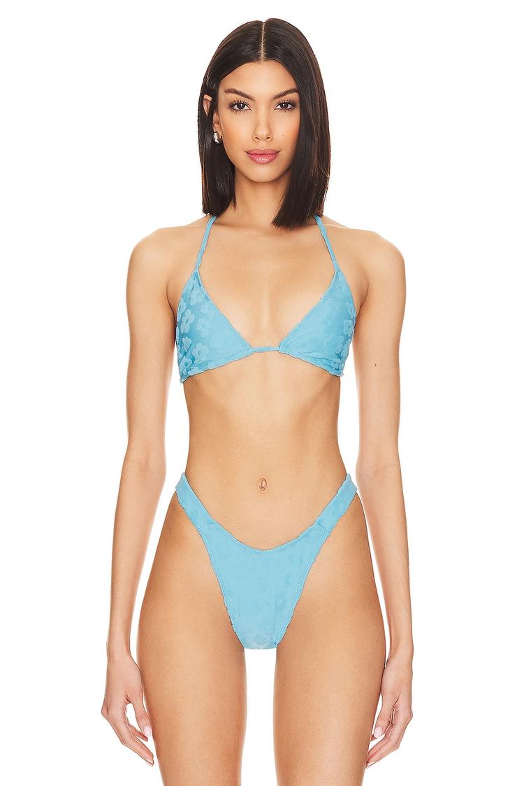 Crisp terrycloth fabric and a flattering slim fit define this Lovers and Friends Vacation Blues Bralette. Featuring a halter neck and tie-up back closure, this cropped swim top in matte aqua is perfect for beach days, pool lounging, and tropical vacations. The spaghetti straps and unpadded design offer effortless comfort and a laid-back vibe ideal for summer escapes and resort wear.