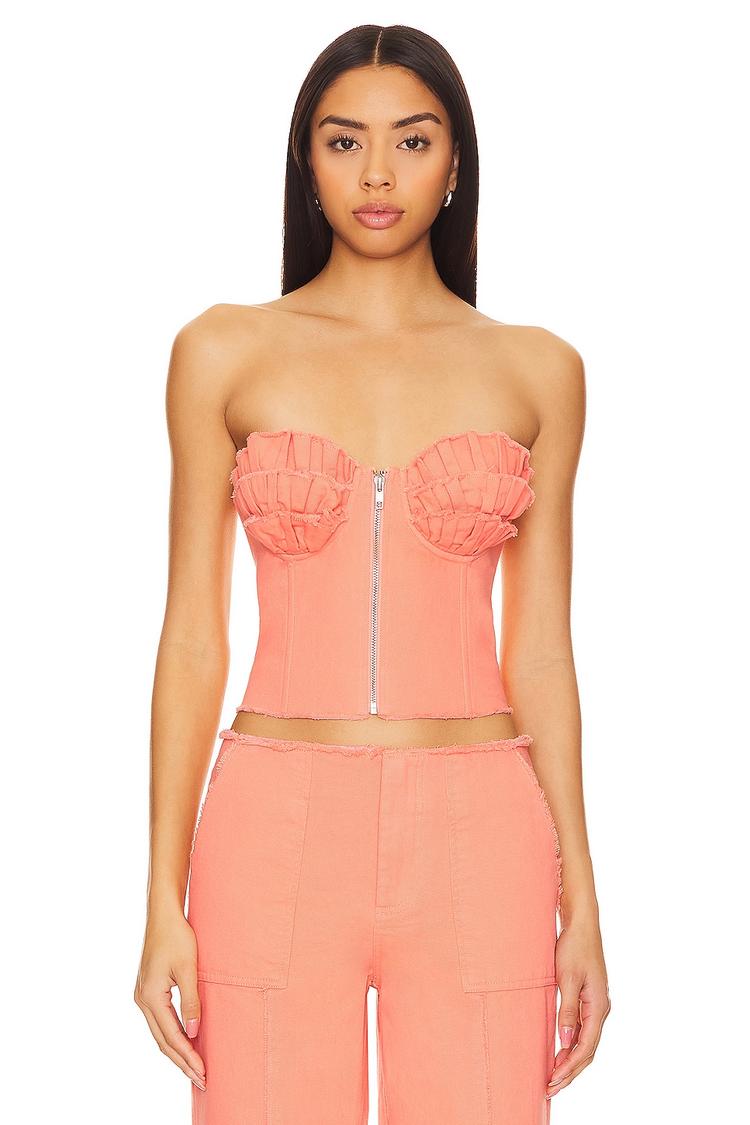 Soft orange twill fabric shapes this cropped corset bustier top with a fitted silhouette and strapless, sleeveless design. The straight neckline is enhanced by playful ruffle padded cups and a boned bodice, secured by an exposed front zipper closure. Perfect for spring and summer, it brings a cute, trendy, and romantic vibe ideal for casual outings, brunches, or date nights. Crafted from cotton, rayon, twill, and elastane, this top offers comfort and a youthful, flirty style to elevate your warm-weather wardrobe.