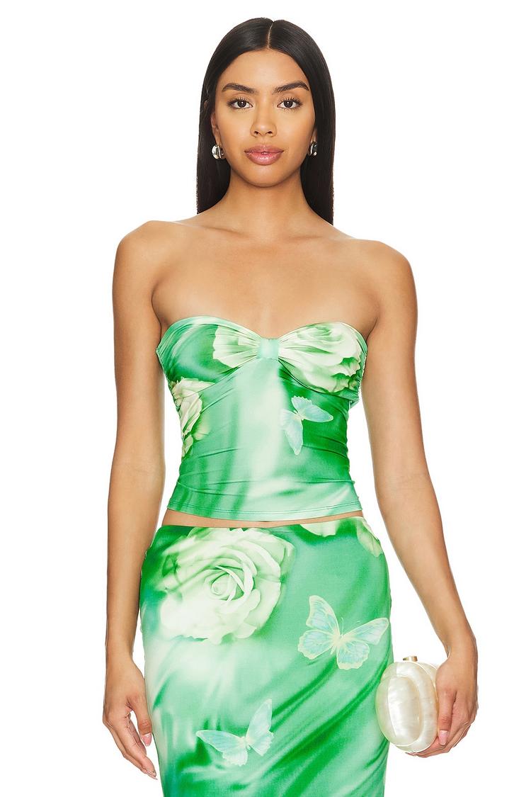 A vibrant green bandeau top featuring a fitted silhouette and a straight neckline, perfect for warm spring and summer days. Crafted from a viscose-elastane blend, this strapless piece offers both comfort and a sleek look. The all-over floral print in white adds a fresh, trendy vibe, making it an ideal choice for casual outings, date nights, or brunch with friends. Its waist-length cut enhances versatility, pairing effortlessly with skirts or high-waisted pants for a chic, season-ready ensemble.
